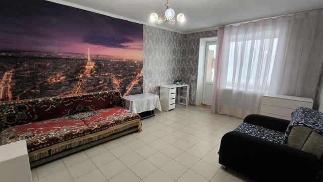 Раскладной диван и раскладное кресло в большой комнате с лоджией.
